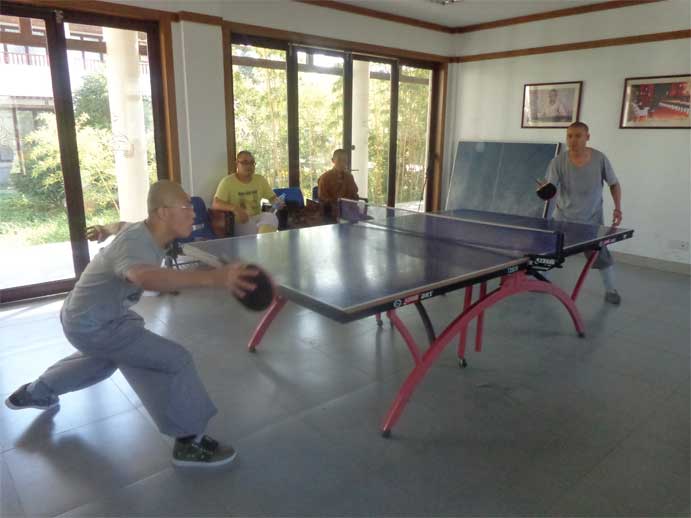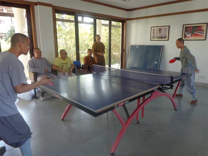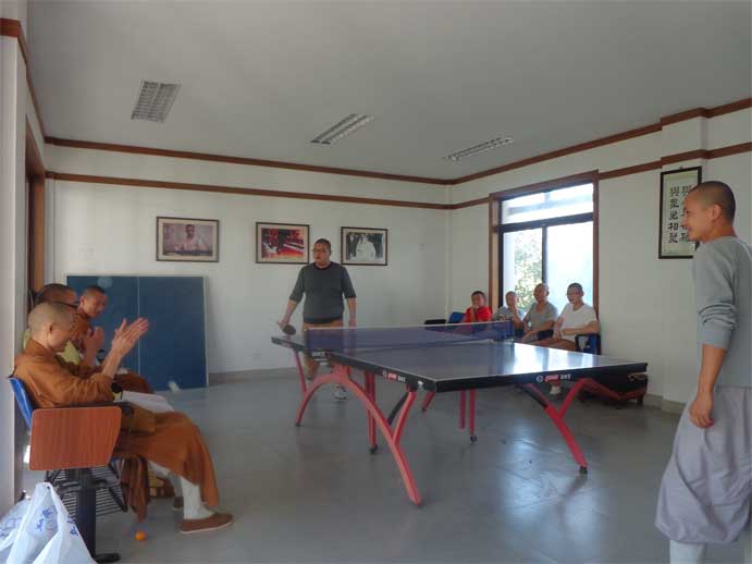参加乒乓球比赛的学僧们精神抖擞,意气风发,时而跃起扣杀,时而下蹲救球。经过激烈的较量,宗化、宗掌分获冠、亚军。教务长仁如法师为获胜者们颁发了奖品。