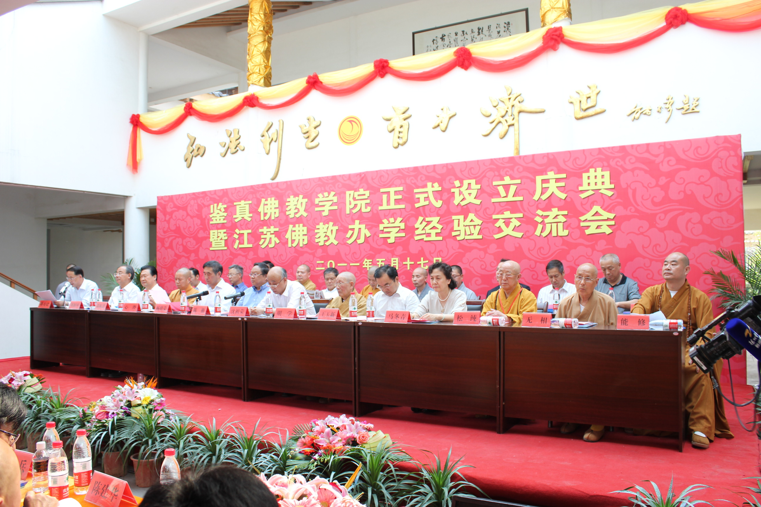 5月17日下午三点,鉴真佛教学院正式设立庆典暨江苏佛教办学经验交流会在鉴真学院进行举行。国家宗教局发来贺电:努力把鉴真学院办成海内外知名的国际佛教交流人才的摇篮。省宗教事务局副局长沈祖荣、副巡视员马冬青,扬州市人大常委会副主任陈勤、副市长王玉新、市政协副主席杨明荣,省佛协明学、松纯会长、无相副会长、心澄副会长、能修副会长、普仁副会长、秋爽副会长,扬州大学周新国副校长、南京大学赖永海院长、净因教授,中国佛学院张厚荣副院长等领导嘉宾150多人参加了庆典。庆典仪式上还向捐资助学单位及友好寺院颁发了功德状,聘请他们加入“鉴真学院之友”联谊会。