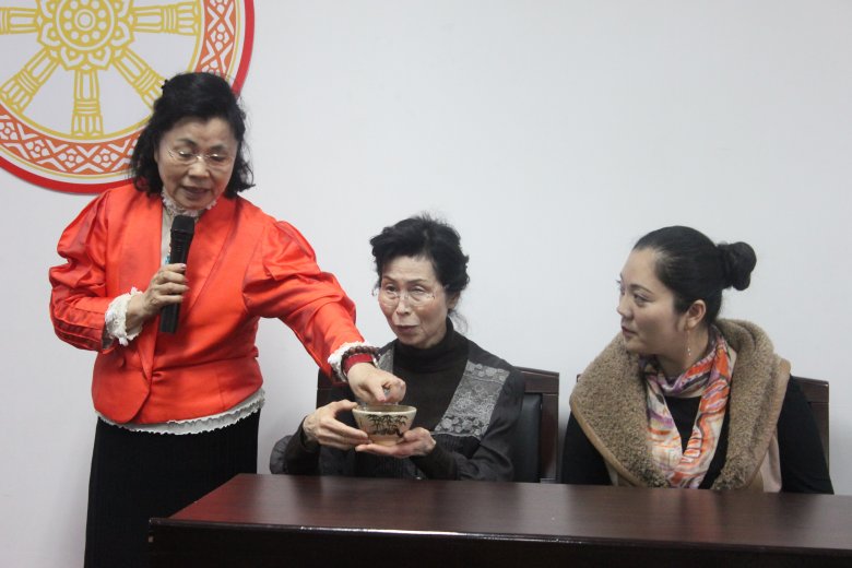 4月9日,日本著名茶道师谷村晃甫女士一行在鉴真学院向学僧传授茶道技艺。