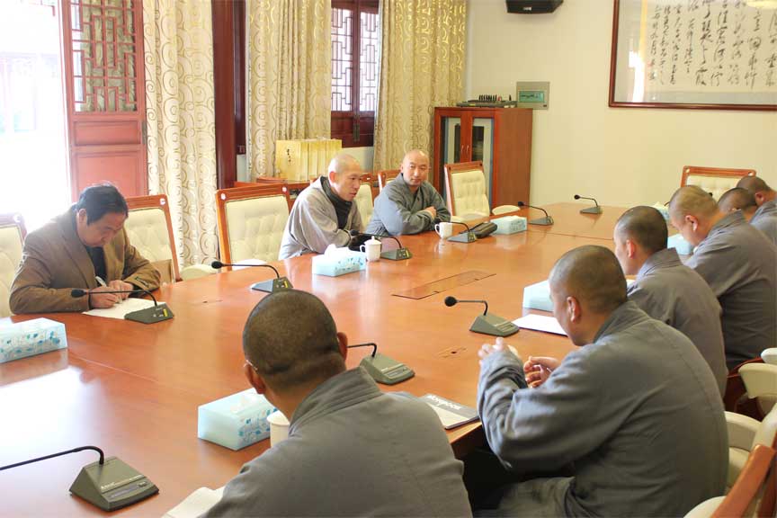 20日下午,重元寺监院、寒山书院教务长本觉法师代表寒山书院常务院长、重元寺方丈秋爽大和尚对我院一行人的来访表示热烈欢迎,同时也请仁如法师转达秋爽大和尚对能修方丈以及蒋院长的慰问和对鉴真佛教学院师僧的祝福。
