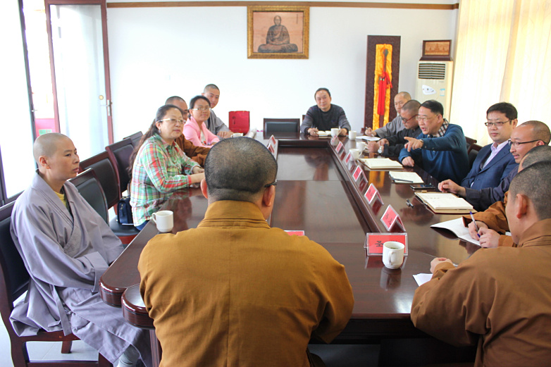 2015年4月23日,重庆佛学院一行6人在重庆市民宗委宗教三处何晓艳处长带领下来我院交流,双方围绕佛教教育面临的招生问题、课程设置、人才培养、师资队伍建设、学僧管理等共性问题进行了深入探讨。蒋寿建副院长向来宾介绍了学院的办学历程、办学特色、办学经费、管理体制等方面的情况,希望双方加强合作交流,优势互补、彰显特色,共同为中国佛教人才培养做出积极贡献。市民宗局院校处卢道领处长和学院全体法师教师参加座谈会。