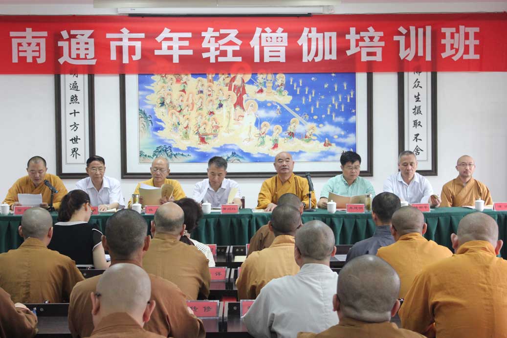 月 日上午, 为期 20 天的南通年轻僧伽培训班在我院多媒体教室举行开班典礼。南通市宗教局副局长黄绍红,南通市佛教协会会长俊才法师,扬州市宗教局副局长朱建明, 大明寺方丈、鉴真学院常务院长能修法师,鉴真学院副院长蒋寿建等,出席开班典礼。