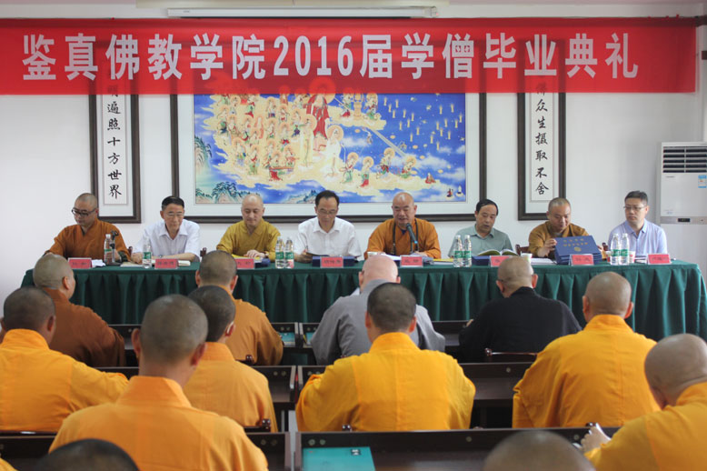 毕业典礼结束时,全院师生全体起立,能修常务院长带领大家齐唱校歌《鉴真东渡》,能修常务院长说,这首校歌由郭沫若作词,李岚清谱曲,这在佛教院校是绝无仅有的。这不仅体现了全院师生对鉴真大师的崇敬之情,而且反映了鉴真学子追随鉴真足迹、争做鉴真传人的宏愿大志,这是激励我们把鉴真学院越办越好的强大精神动力。