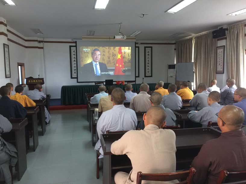 组织师生观看《大国外交》是适应形势的要求,强化对学生进行思想政治教育工作,让他们在学好佛学等文化课程外学好时事政治。