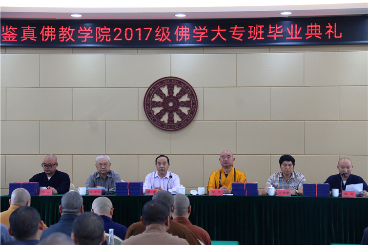 扬州市民宗局廖勇副局长、鉴真学院院长能修大和尚、浙江湖州吴兴区委统战部吕志荣常务副部长、海安市民宗局刘和军副局长、海安市佛协冶然会长、吴兴区佛协惟光常务副会长等来宾出席毕业典礼并讲话。宗金林常务副院长主持毕业典礼。