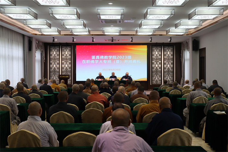 6月26日8时30分许,鉴真学院法雨讲堂梵音缭绕,法喜充满!在庄严的国歌声中,我院举行2023级在职佛学大专班(夏季班)开班典礼。本期佛学大专班招生131人,学员来自全国20个省、市、自治区。 开班仪式上,常务副院长宗金林对全体学员表示热烈欢迎,并介绍了学院办学情况。希望大家一要遵守班级管理制度,树立良好形象;二要注重学修一体,树立良好学风;三要妥善安...