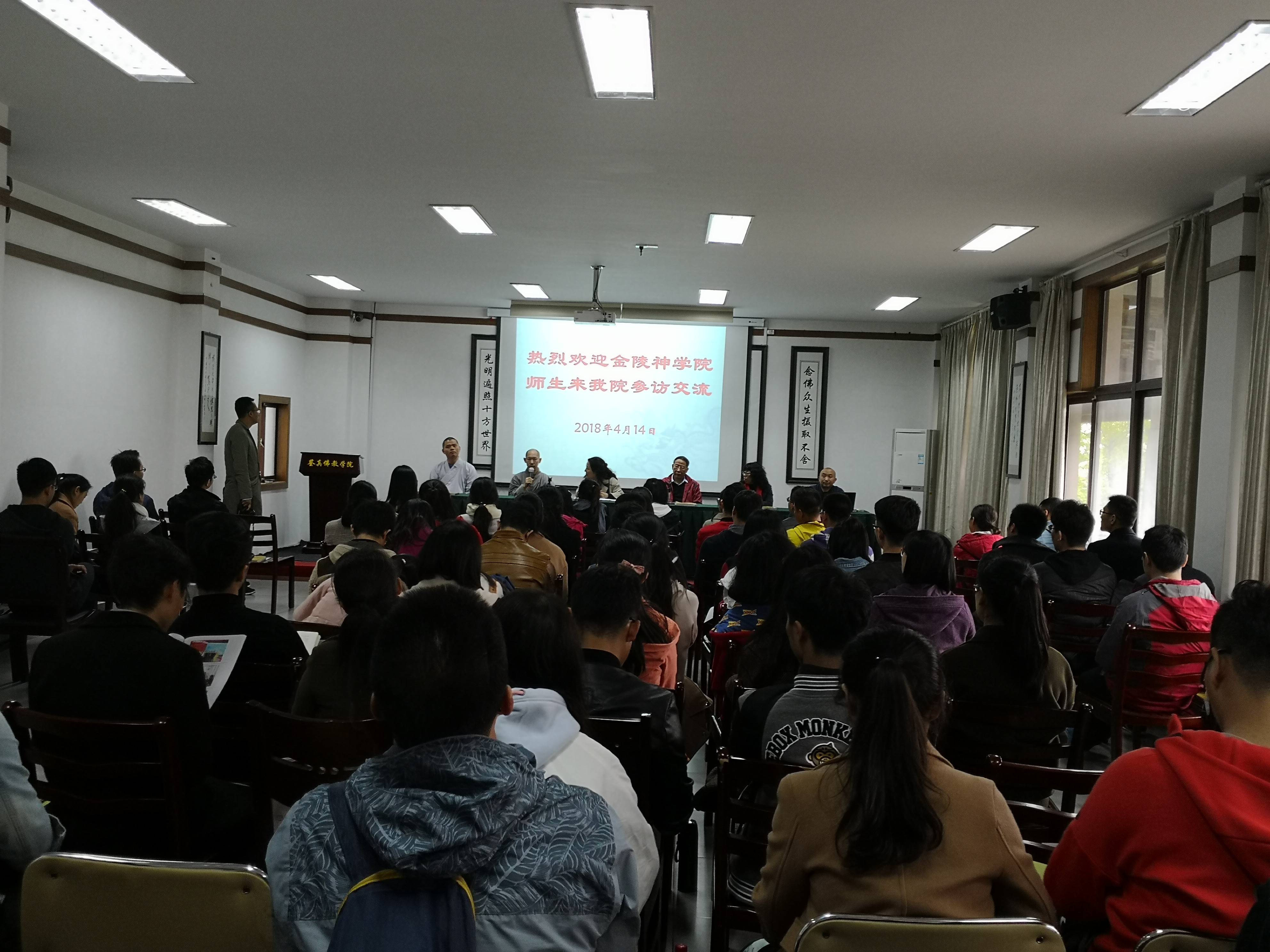 2018年4月14日下午,金陵神学院师生一行90多人来我院参访交流。蒋寿建副院长向来宾介绍了鉴真佛学院的办学历程和办学特色,以及学院全日制本科教育、大专函授教育、佛教教职人员轮训培训和对外文化交流四大办学功能。现场交流时,神学院学生踊跃提问,分别就佛教“无我”、“无常”、佛教如何对外传播以及教职人员社会保障等问题,与学院明空、演海、智林三位法师进行了互动交流...
