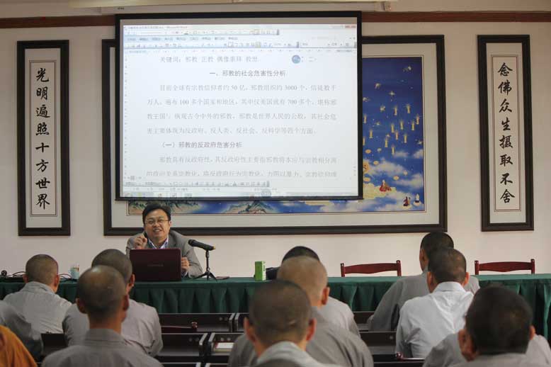 10月30日下午,扬州大学社会发展学院刘正峰教授应邀来我院为学僧进行了题为“邪教的社会危害及其辨别”的专题讲座。开设这一讲座旨在增强我院学僧爱国爱教意识,坚持佛教的正信正念,进一步提高我院学僧的反邪教意识和能力。刘教授首先从邪教的概念进行讲解,接着从四个方面对邪教的危害进行了分析,揭露了邪教“反政府、反社会、反科学、反人类”的危害性。刘教授还具体从邪教偶像崇...