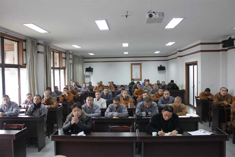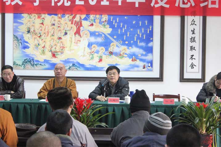2015年1月24日上午9点,伴随着三宝歌声,我院隆重召开2014年度总结会。市民宗局朱建明副局长、院校处卢道岭处长及全体教职工、学僧100多人出席会议。过去的一年,在上级宗教部门和佛教协会的正确领导下,在社会各界关心支持下,全院上下团结精进,教学、管理各项工作稳步推进,取得了新的成绩。蒋寿建副院长从思想政治教育进一步加强,学院管理基础进一步夯实,学院办学特...