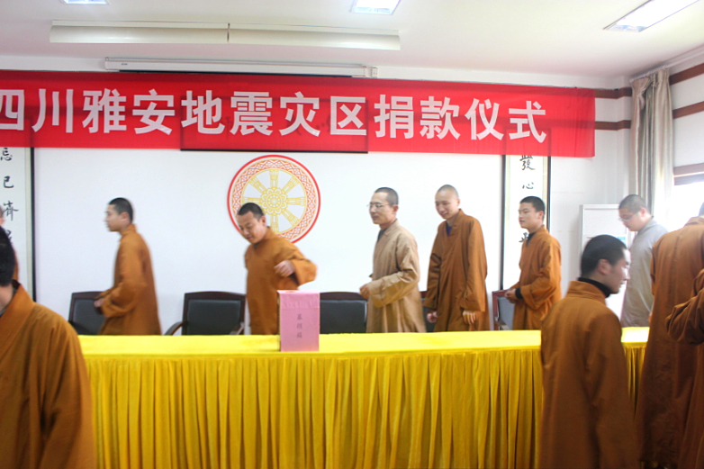 2013年4月24日,鉴真学院组织全体学僧和教职工为四川雅安地震灾区爱心捐赠活动,大家纷纷慷慨解囊,共为灾区募得善款近2500元。