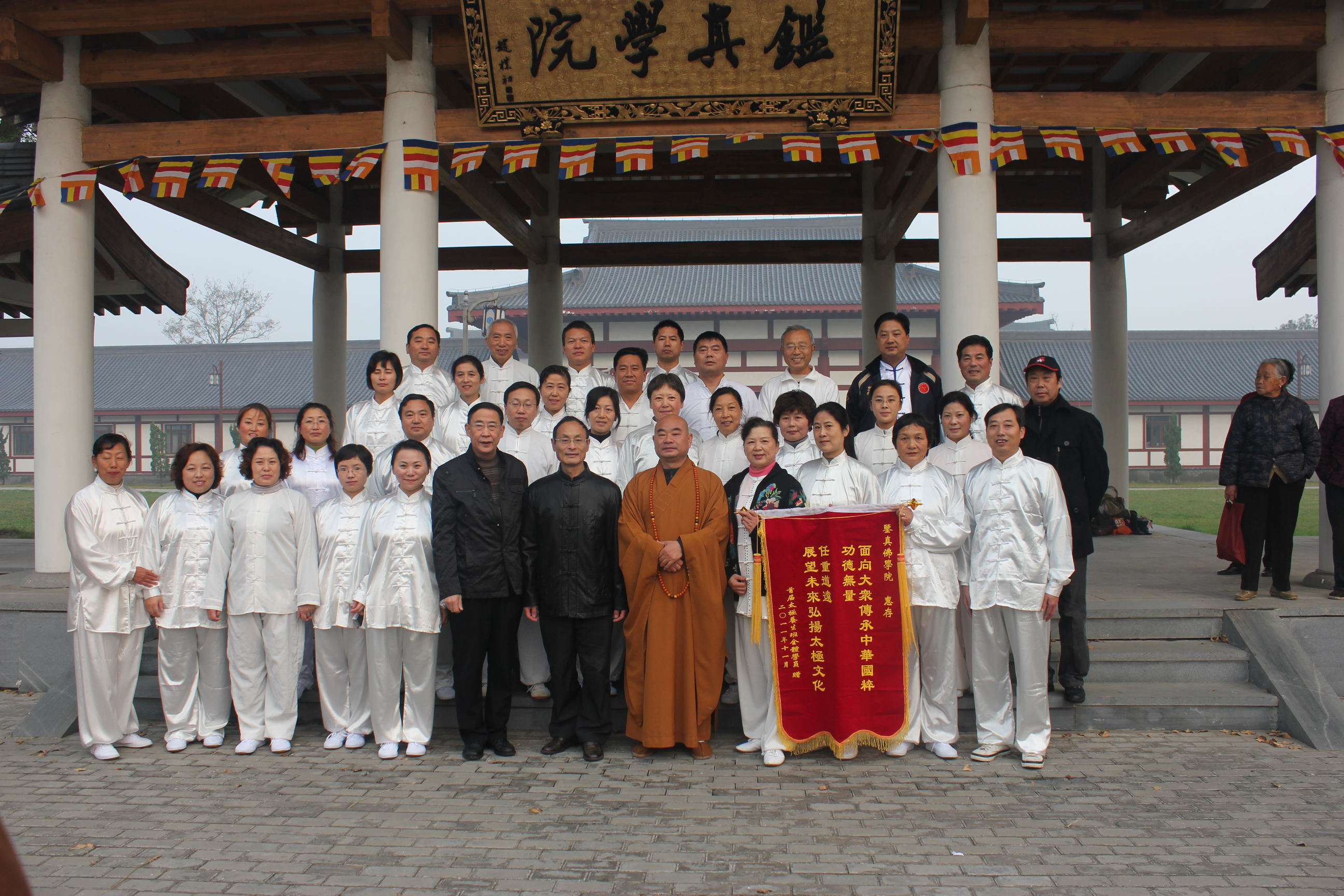 2011年11月23日7:30分,鉴真佛教学院首期太极养生班30多名学员进行了太极汇报表演。为回报社会,利益众生,本期太极班全部面向社会免费招收,由国家级资深武术裁判,扬州大学体育教授仇志刚先生亲自教练;能修方丈出席结业仪式并开示,勉励学员用太极练好身体,用佛教思想调节好内心,为社会多做贡献。院领导蒋寿建、朱操、教务长仁如法师出席活动。(办公室宋华忠)太极表...